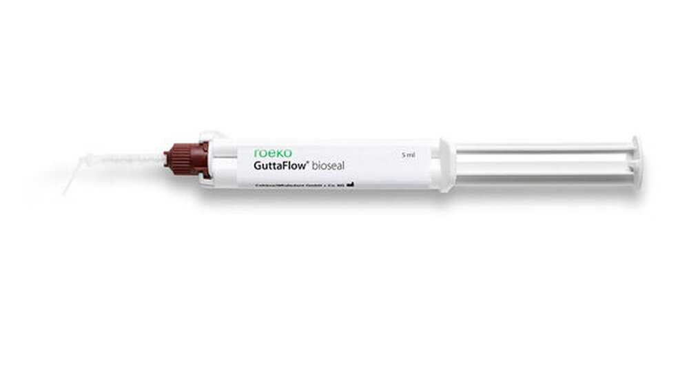 Beim Kontakt mit Flüssigkeiten stellt der bioaktive Werkstoff natürliche Reparaturbausteine wie Kalzium und Silikate zur Verfügung. Zudem setzt er biochemische Prozesse in Gang, welche die Regeneration unterstützen. Nach dem Aushärten und bei Kontakt mit Flüssigkeiten bildet GuttaFlow bioseal sogenannte Hydroxylapatitkristalle an der Oberfläche. Diese verbessern die Adhäsion und regen die Regeneration von Knochen- und Dentingewebe an. GuttaFlow bioseal kombiniert bei Zimmertemperatur fließfähige Guttapercha mit einem entsprechenden Sealer. Die Verarbeitungszeit beträgt nur ca. 10 – 15 Minuten. GuttaFlow bioseal ist im Dentalfachhandel in der praktischen Automix-Spritze erhältlich.