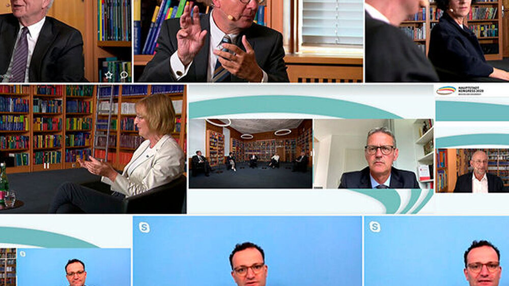 In den vergangenen Jahren trafen sich rund 8.000 Teilnehmer im Berliner CityCube, diesmal war es eine kleine Runde aus fünf Experten plus Minister. Der Hauptstadtkongress Digital ist ein digitaler Ableger, der auch in Zukunft regelmäßig durchgeführt werden soll. Thema heute: „Die Krise als Innovationstreiber: Zeitenwende im Gesundheitswesen?“