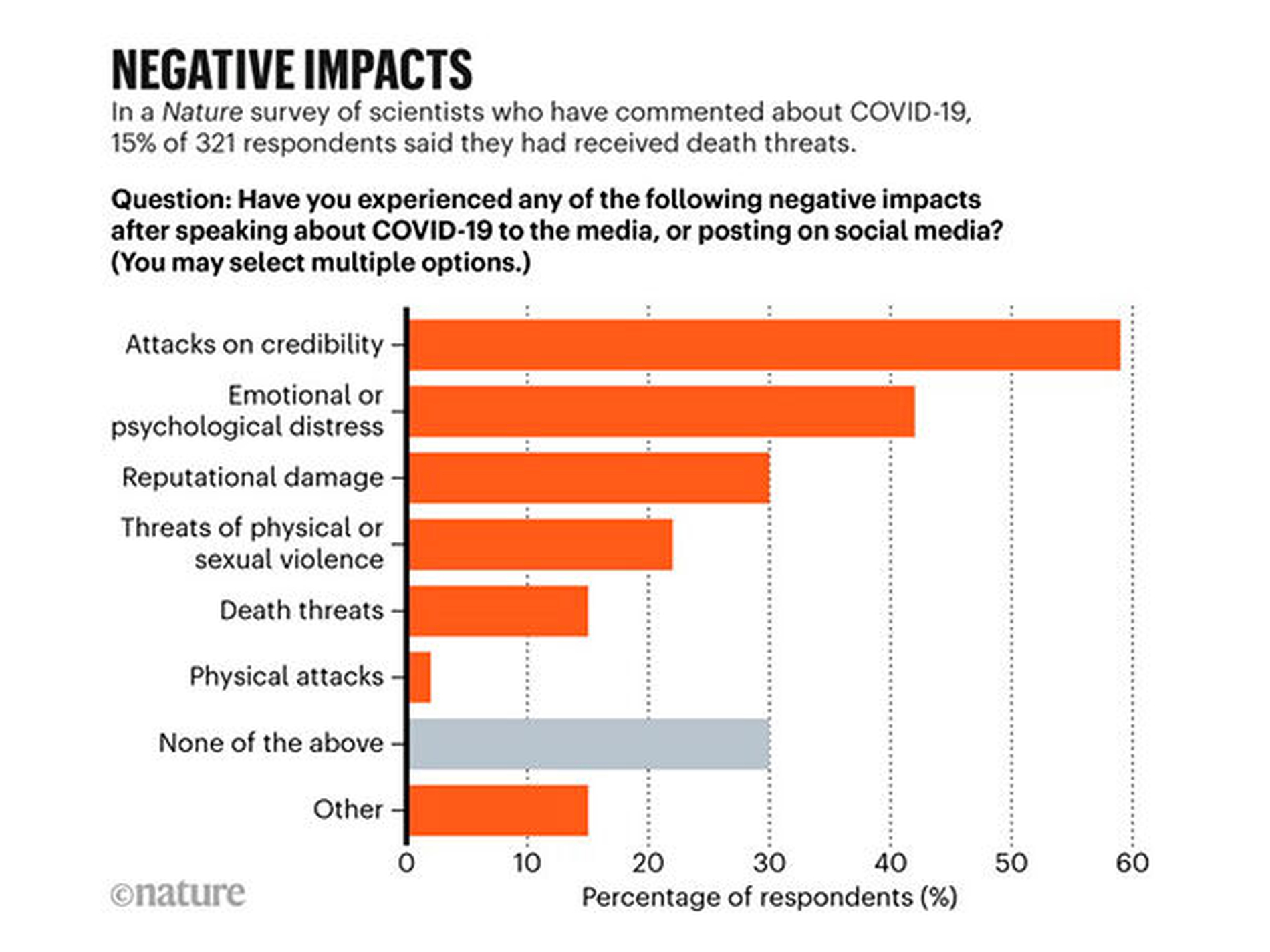 Insgesamt 321 Forscher beantworteten die Umfrage. Danach haben mehr als zwei Drittel als Folge ihrer Medienauftritte oder Social-Media-Kommentare negative Erfahrungen gemacht, mehr als jeder fünfte berichtet über Androhungen körperlicher oder sexueller Gewalt. Insgesamt 15 Prozent hatten Morddrohungen bekommen. 80 Prozent erlebten in den sozialen Medien Angriffe und Versuche, ihre Glaubwürdigkeit zu diskreditieren. Einige Wissenschaftler erklärten, dass ihr Arbeitgeber Beschwerden über sie erhalten habe oder dass ihre Wohnadresse online bekannt gegeben worden sei. Sechs Wissenschaftler gaben sogar an, dass sie körperlich angegriffen wurden.