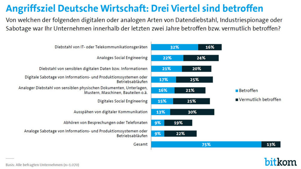 Drei Viiertel aller befragten Unternehmen waren in den vergangen beiden Jahren von Angriffen betroffen und weitere 13 Prozent vermuten dies, berichtet der Bitkom mit Verweis auf eine eigene Studie, für die mehr als 1.000 Geschäftsführer und Sicherheitsverantwortliche quer durch alle Branchen repräsentativ befragt wurden.