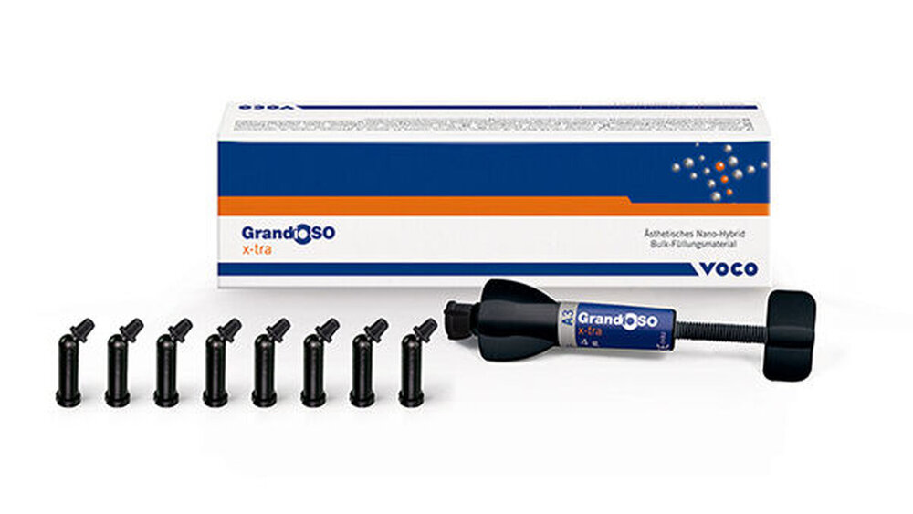 Denn das stopfbare Bulkfill-Material überzeugt mit seinem guten Handling und seiner sicheren Durchhärtung in 4-mm-Schichten. Mit einem Füllstoffgehalt von 86 Gew.-%, einer Volumenschrumpfung von nur 1,4 Vol.-% und einem geringen Schrumpfungsstress ist GrandioSO x-tra ein Bulkfill-Komposit mit starken physikalischen Eigenschaften.