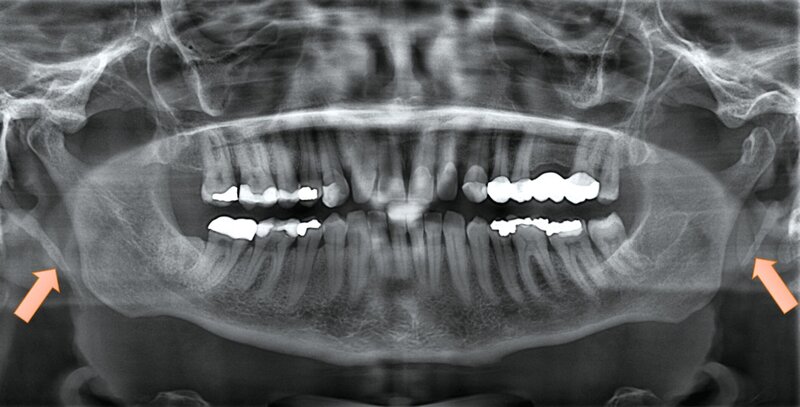 Eine 49-jährige Patientin stellte sich vor, nachdem ihr Hauszahnarzt im Rahmen einer Routineuntersuchung ein Orthopantomogramm (OPG) angefertigt hatte. Dabei war zufällig eine beidseitige Verlängerung des Processus styloideus aufgefallen, dabei auf der rechten Seite deutlich ausgeprägter (Abbildung 1).
