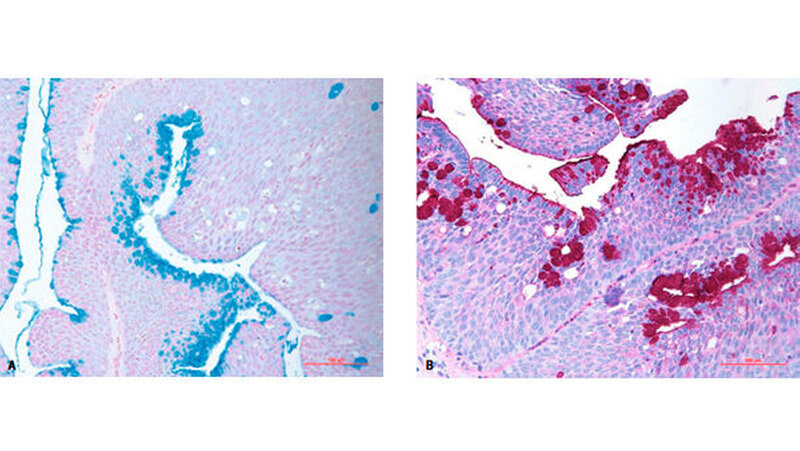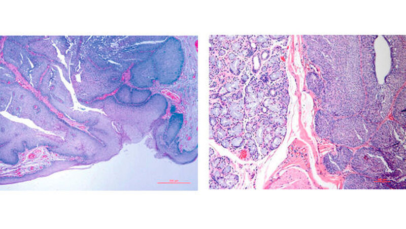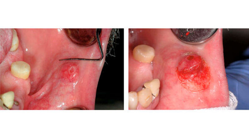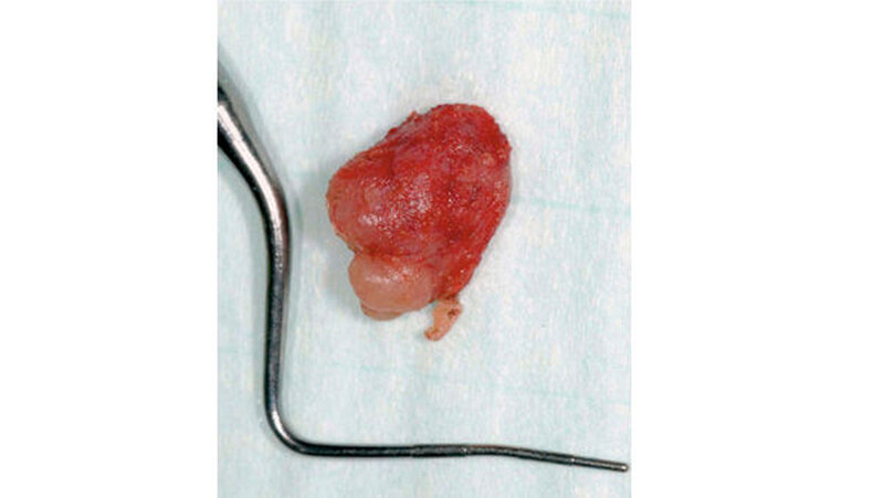 Das Tumorgewebe war zentral zystisch und bestand aus breiten Verbänden epidermoider Zellen mit papillären Projektionen ins Lumen und eingestreuten schleimbildenden Zellen. Angrenzend zum neoplastischen Gewebe erkennt man eine reguläre kleine Speicheldrüse (Abbildungen 4 bis 6). Die Wundheilung verlief komplikationslos (Abbildung 7). Um ein Rezidiv auszuschließen, wird der Patient vorerst regelmäßig (alle 6 Monate) nachkontrolliert.