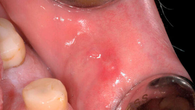 Ein 49 Jahre alter Patient wurde der Klinik zur Abklärung einer seit fünf Jahren persistierenden Mundschleimhautveränderung zugewiesen. Der Mann war zum Zeitpunkt der Erstuntersuchung beschwerdefrei, hatte aber seit zwei Jahren eine kontinuierliche Größenzunahme der Läsion beobachtet. Klinisch präsentierte sich eine runde, gestielte, weiche, verschiebliche, 9×9 mm große, gut durchblutete Veränderung mit einem zentralen Ulkus an der bukkalen Mukosa regio 35 (Abbildung 1).