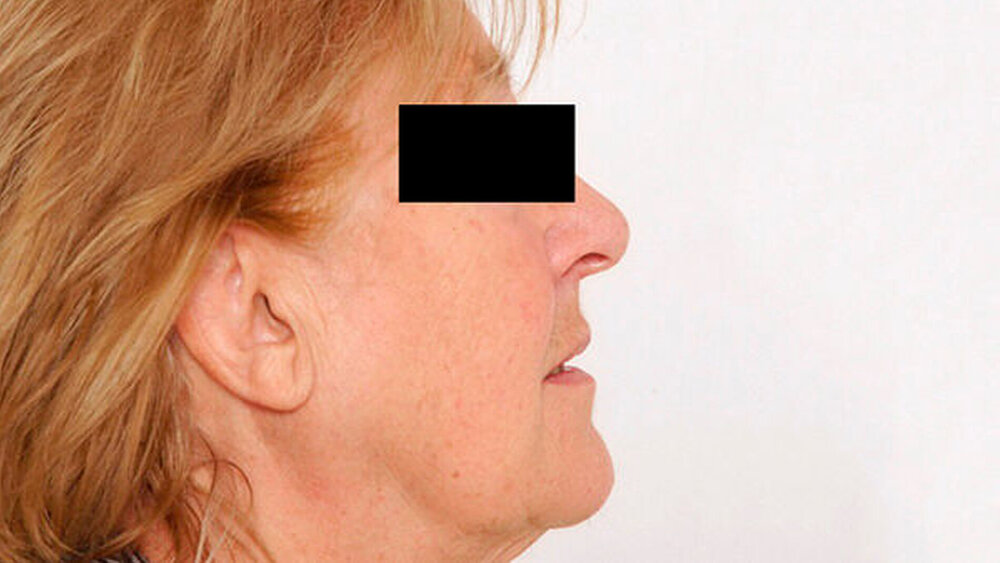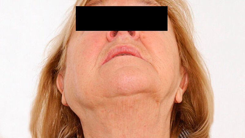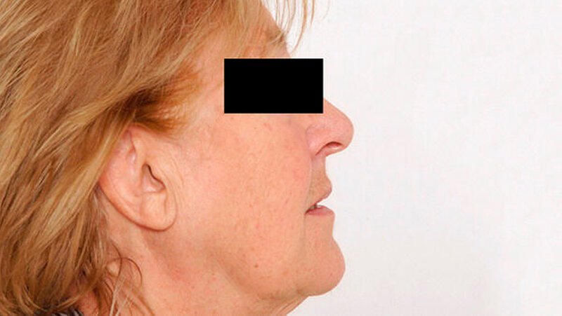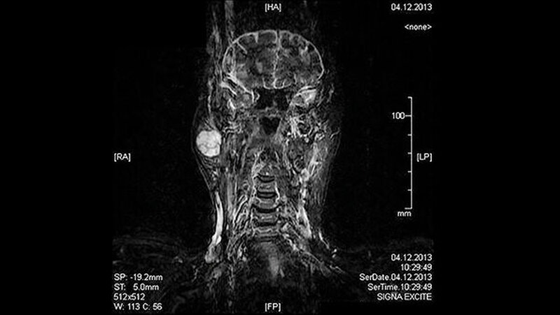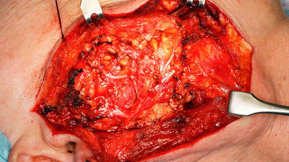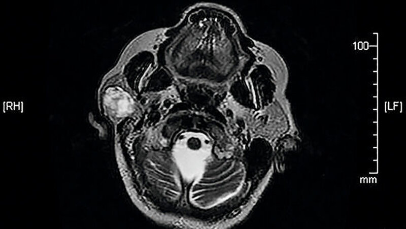Eine 81-jährige Patientin wurde bei einer anamnestisch vor drei Jahren erstmals aufgefallenen und seither größenprogredienten Schwellung präaurikulär rechts (Abbildungen 1 bis 3) mit der Bitte um Weiterbehandlung an die Klinik für Mund-, Kiefer- und Gesichtschirurgie der LMU München überwiesen. Die alio loco durchgeführte bildgebende Diagnostik mittels MRT hatte einen abgegrenzten Prozess in der rechten Glandula parotidea gezeigt (Abbildungen 4 und 5). In der Zusammenschau der klinischen und der radiologischen Befunde wurde die Verdachtsdiagnose eines pleomorphen Adenoms im Bereich der Glandula parotis rechts gestellt.
