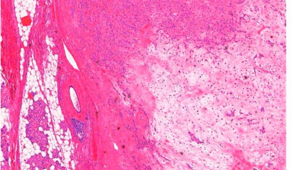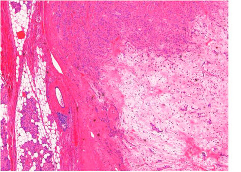Die Untersuchung des eingesandten Weichgewebsresektats der Parotis rechts (Abbildung 7) ergab ein in sano entferntes pleomorphes Adenom neben regelhaft strukturiertem Speicheldrüsenparenchym mit mäßiger Lipatrophie (Abbildung 8) und insgesamt drei tumorfreien Lymphknoten. Es zeigte sich kein Anhalt für Dysplasie oder für Malignität.