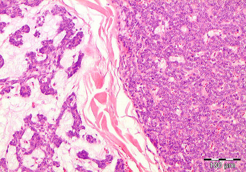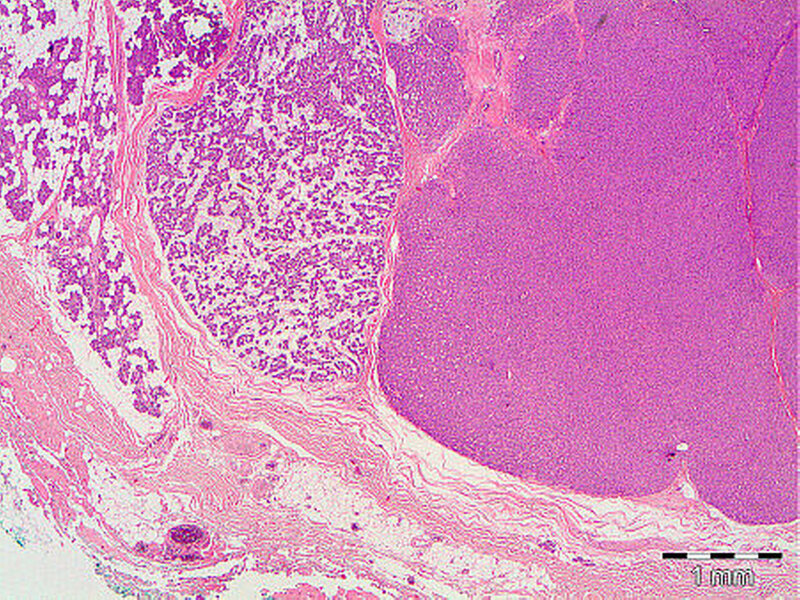 Der histopathologische Befund bestätigte den Verdacht eines pleomorphen Adenoms mit kapselartiger Begrenzung zum umgebenden, strukturell unauffälligem Speicheldrüsenparenchym der linken Glandula parotis (Abbildungen 5 und 6).