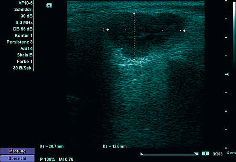 Zur weiteren Diagnostik erfolgte eine Sonografie (Abbildung 2) sowie eine drei- dimensionale Bildgebung mittels MRT (Abbildung 3). Hier zeigte sich eine Formation in der linken Glandula parotis ohne Infiltration der Nachbarstrukturen, die bildmorphologisch am ehesten einem pleomorphen Adenom entsprach.