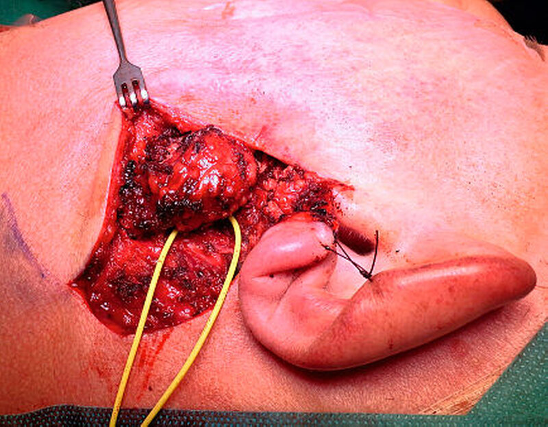 Es wurde eine laterale Parotidektomie mit intraoperativem Fazialismonitoring durchgeführt (Abbildung 4). Die orale Antikoagulation mit Marcumar wurde stets fortgesetzt.