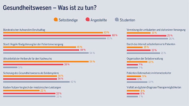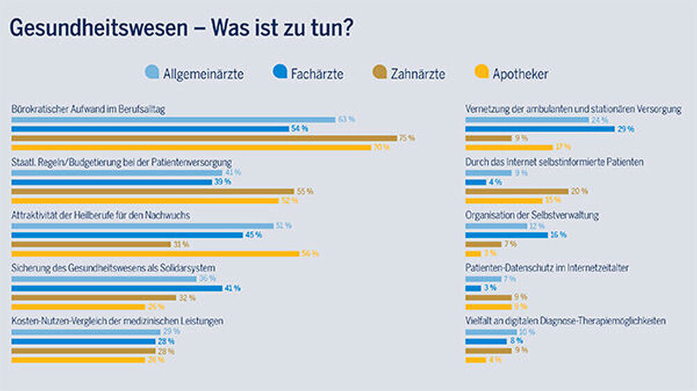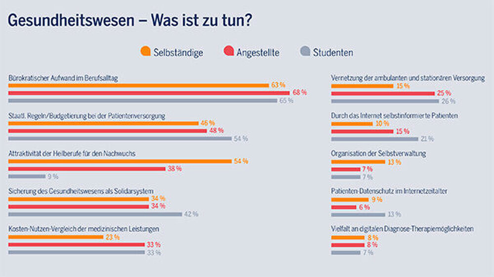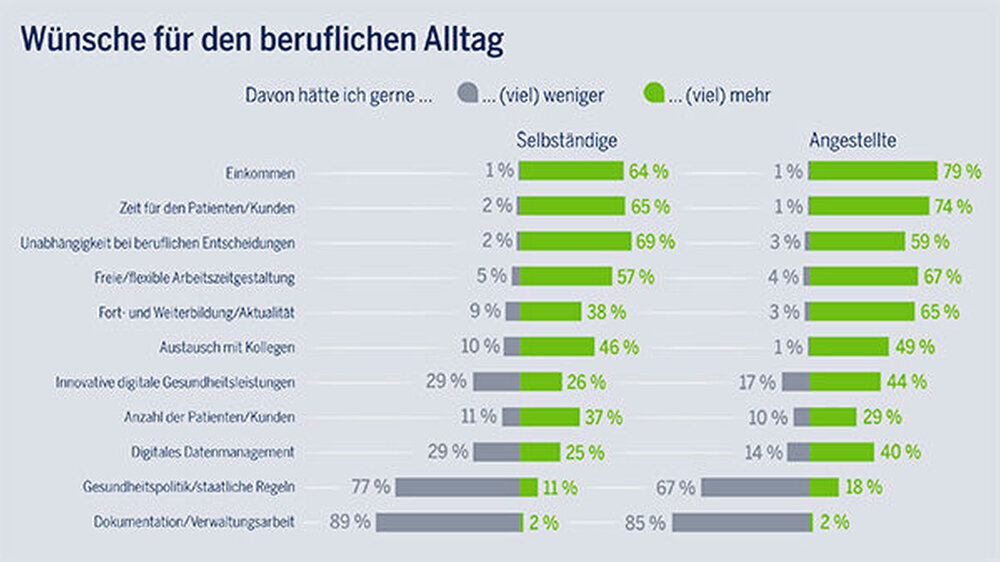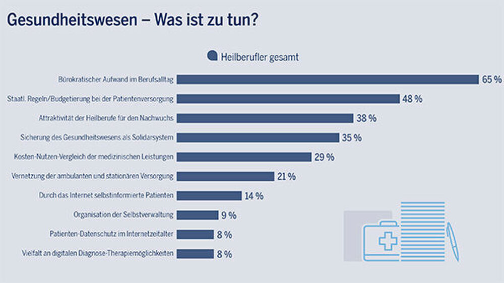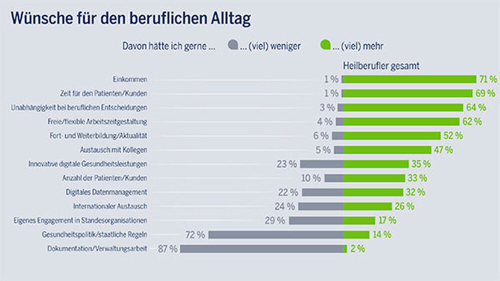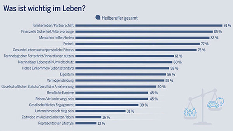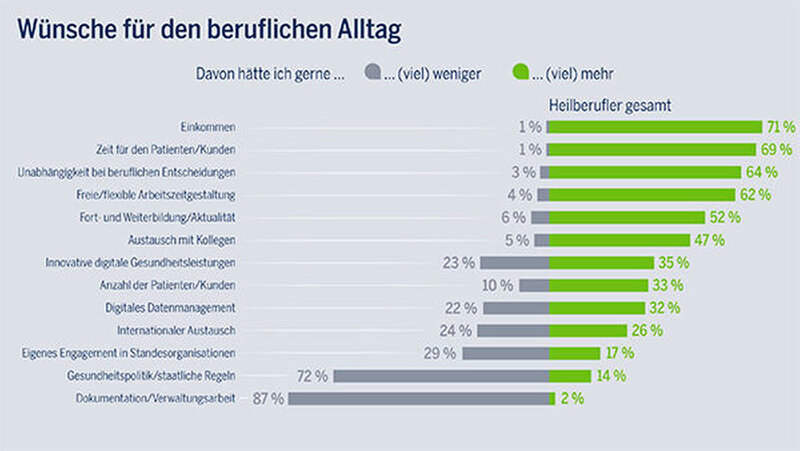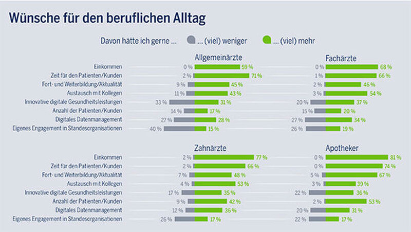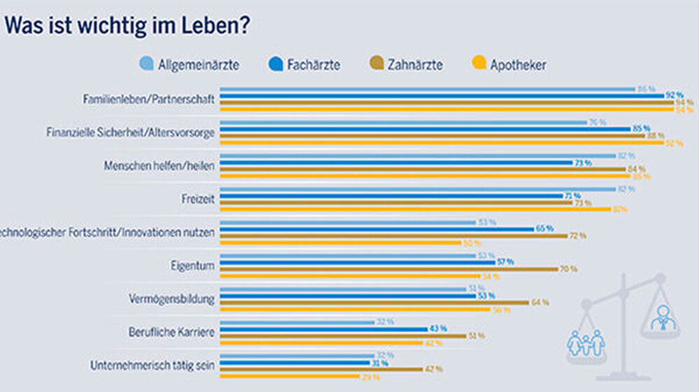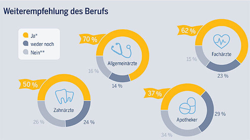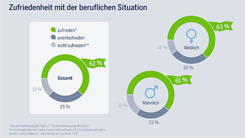 Methodik: Für die Studie "Inside Heilberuf" wurden im Auftrag der Deutschen Apotheker- und Ärztebank (apoBank) 500 Heilberufler durch das Institut DocCheck Research befragt. Der Online-Umfrage lag eine randomisierte Stichprobenziehung zugrunde, quotiert nach Berufsgruppen und Beschäftigungsverhältnis der Berufstätigen (50 Prozent angestellt, 50 Prozent selbstständig).