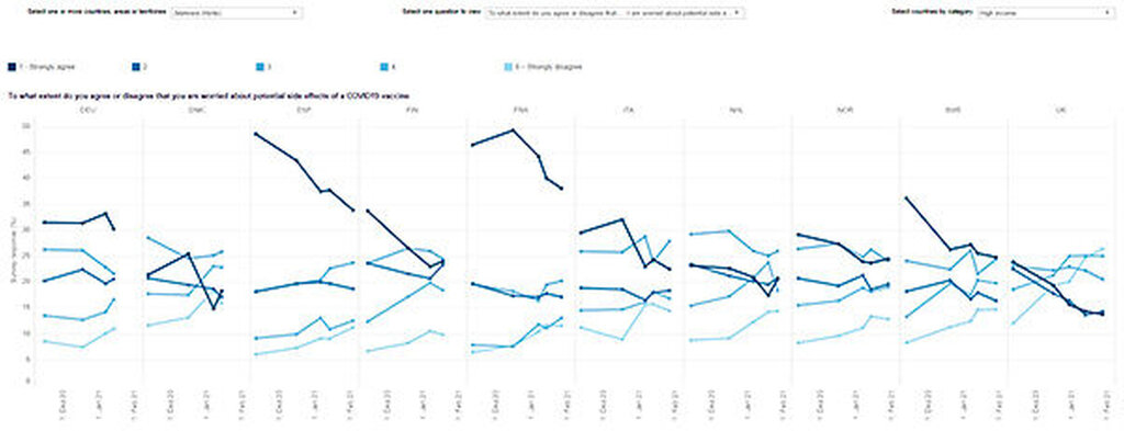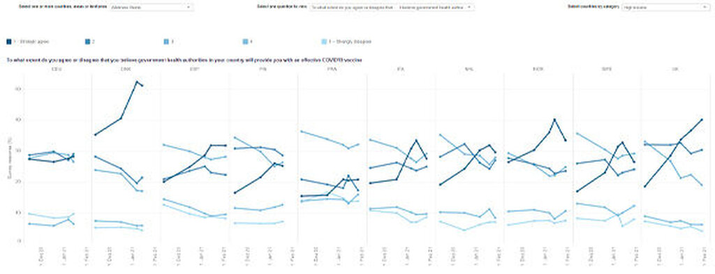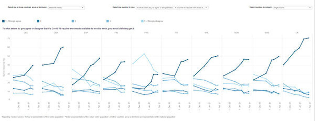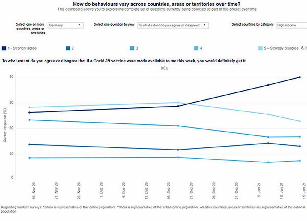 In 11 der 15 Länder ist der Prozentsatz der Befragten, die stark vom Impfstoff überzeugt sind, seit November 2020 gestiegen. In Deutschland betrug dieser Wert Mitte Januar 2021 rund 40 Prozent, die übrigen 13 Prozent stimmen zu, aber nicht „stark”. Rückläufig ist die Zustimmung indes in Australien, Japan, Südkorea und Singapur.