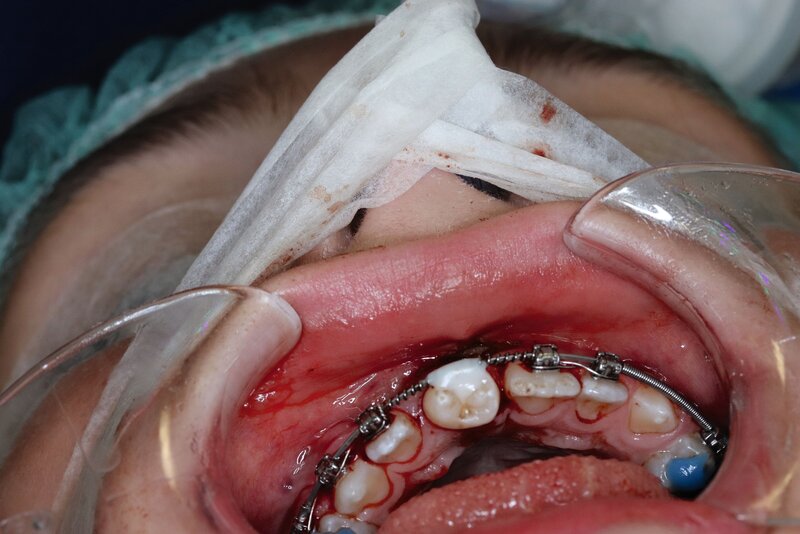 Um störende okklusale Kontakte zu vermeiden, wurde der Zahn in eine leichte Infraposition gestellt und der Biss in der initialen Einheilphase von ein bis zwei Wochen leicht gesperrt, so dass die anschließende kieferorthopädische Extrusion des Zahnes ungestört durchgeführt werden konnte. Mit der kieferorthopädischen Bewegung und Feineinstellung des Transplantats wurde ab der vierten postoperativen Woche begonnen.