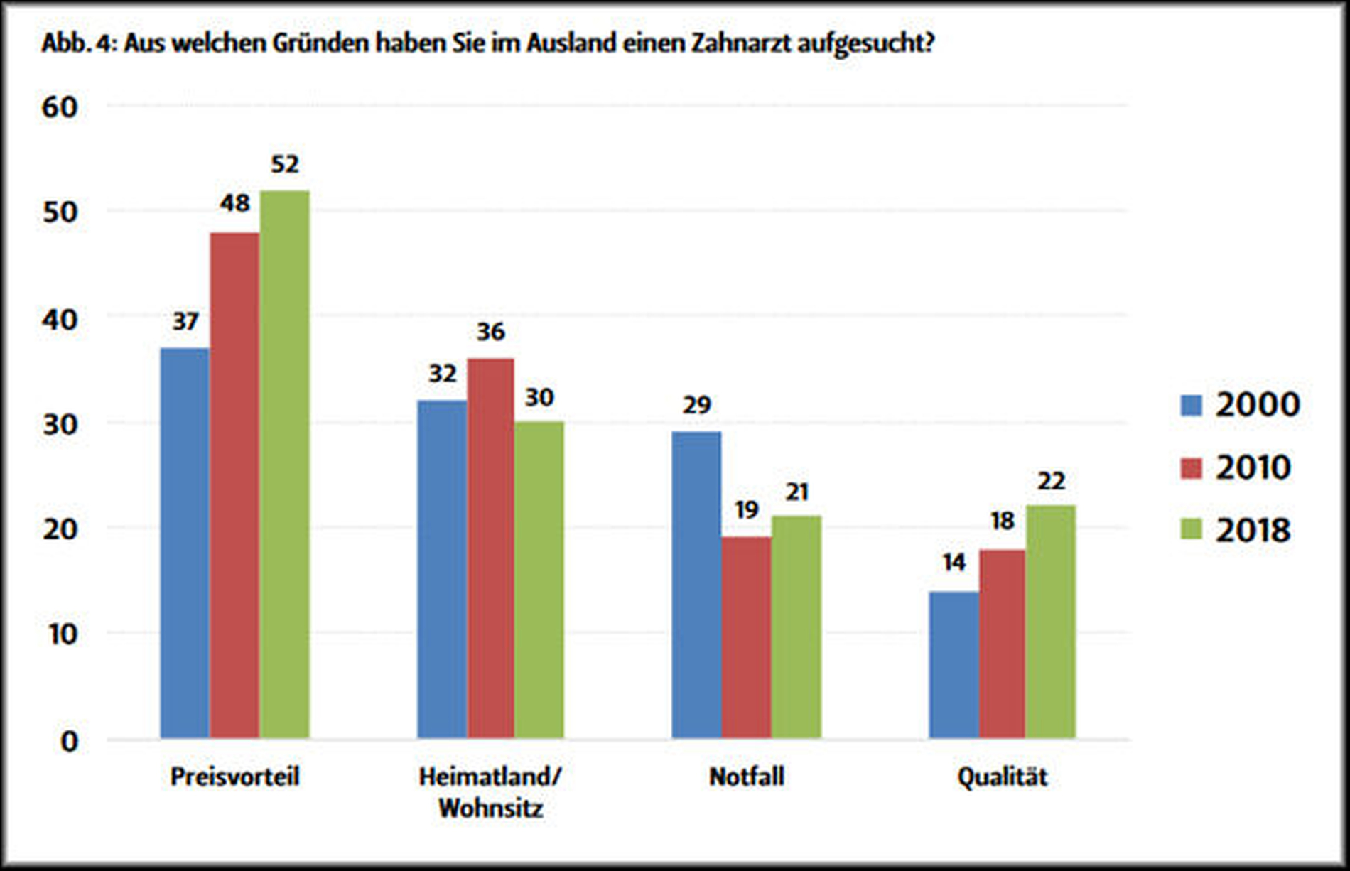 Als weitere Ursache für Dentaltourismus machen die Studienautoren die nicht-schweizerische Herkunft vieler Patienten aus: Migranten ließen sich vorzugsweise in ihrem Heimatland oder an einem weiteren, ausländischen Wohnsitz behandeln, heißt es. Die beliebteste Destination für Zahnbehandlungen im Ausland war 2018 Deutschland (22 Prozent), es lag damit vor Frankreich (16 Prozent), Ungarn (9 Prozent), Italien und Portugal (jeweils 6 Prozent).