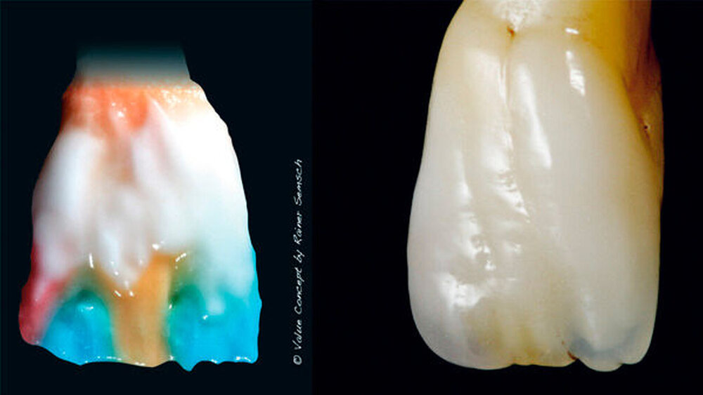 ZTM Rainer Semsch erläutert: "ceraMotion® ist im Handling erstaunlich unkompliziert und sicher, es bietet uns die Möglichkeit, geniale ästhetische Ergebnisse zu erreichen. Das Value Concept gibt uns darüber hinaus die Möglichkeit, dem natürlichen Vorbild noch einen Schritt näher zu kommen.“ Kern des Sets sind zwei Massen, mit denen man die Helligkeit sowohl im Dentin als auch im Schneidebereich steuern kann, ohne die eigentliche Farbe zu verändern. Die ausgewählten Transpa Modifier Value-Keramikmassen ergeben natürliche lichtoptische Effekte speziell im Hals- und Schneidebereich. Weitere Effektmassen beeinflussen die Intensität von opaleszierenden Schneideanteilen und bieten Farbsicherheit auch bei geringen Platzverhältnissen.
