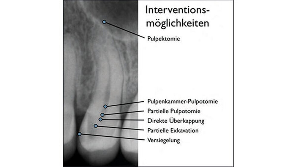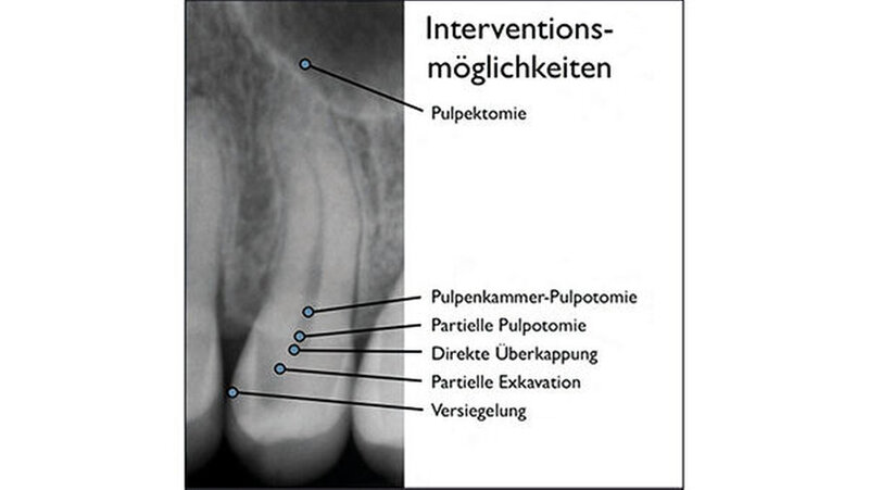 Grundsätzlich lässt sich aufgrund der momentanen Kenntnislage nicht klar sagen, welche Intervention wann die beste ist. Insbesondere beim bleibenden Zahn mit voll ausgebildetem Wurzelwachstum und Karies bis ins pulpennahe Dentin spricht nichts dagegen, bis auf hartes Dentin zu exkavieren und, wenn die Karies bis in die Pulpa reicht, eine Wurzelkanalbehandlung einzuleiten. Alle anderen Vorgehensweisen sind zwar von hohem akademischem Interesse, aber momentan nicht genügend mit verlässlichen Daten untermauert.
