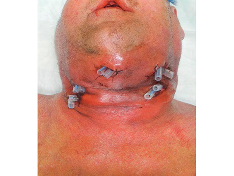 Der Patient wurde umgehend notfallmäßig operiert, wobei die Intubation durch die Atemwegsverlegung nur fiberoptisch möglich war. Zur Fokussanierung wurde eine Totalsanierung mit Entfernung aller Zähne und Wurzelreste durchgeführt. Zudem erfolgten mehrere Abzessinzisionen von extraoral, wobei sich insgesamt 700 Mililiter Pus entleerten. Zur Drainage und Spülung des Abszesses wurden insgesamt zehn Drainagen nach submandibulär, perimandibulär, parapharyneal, submental und supraklaviculär eingebracht (Abbildung 3).