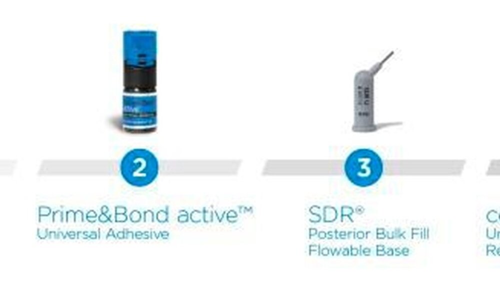 Die Kombination dieser vier Produkte von Dentsply Sirona überzeugt durch optimale Anpassung an die Techniken des Behandlers und die Erfordernisse der Füllung. Die Teilmatrize Palodent V3 schafft eine ideale natürliche Kontur und einen präzisen Kontaktpunkt für die Applikation der Füllungsmaterialien. Das Universaladhäsiv Prime&Bond active liefert eine lückenlose Adhäsivschicht und eine dichte Versiegelung. Das fließfähige SDR sorgt dafür, dass die fertige Füllung die natürliche Kontur der Matrize annimmt, ohne Randpalten oder Hohlräume im approximalen Kasten. Das Komposit ceram.x universal passt sich perfekt an Kavität und SDR Schicht an, vereinfacht die Farbanpassung und das Finieren und stellt so eine korrekte Okklusalfläche und eine hohe Ästhetik sicher.