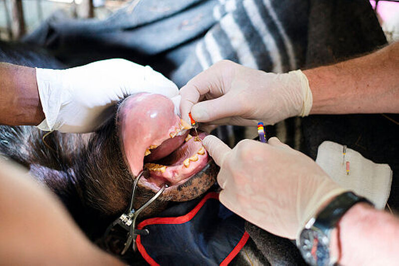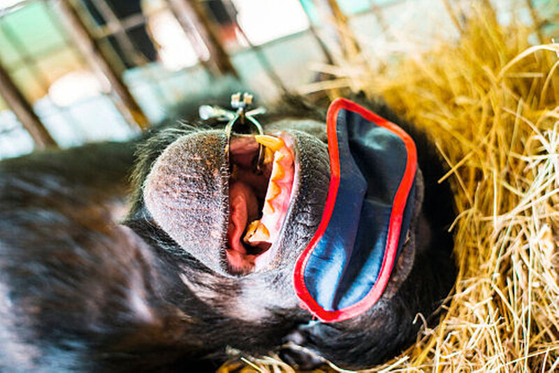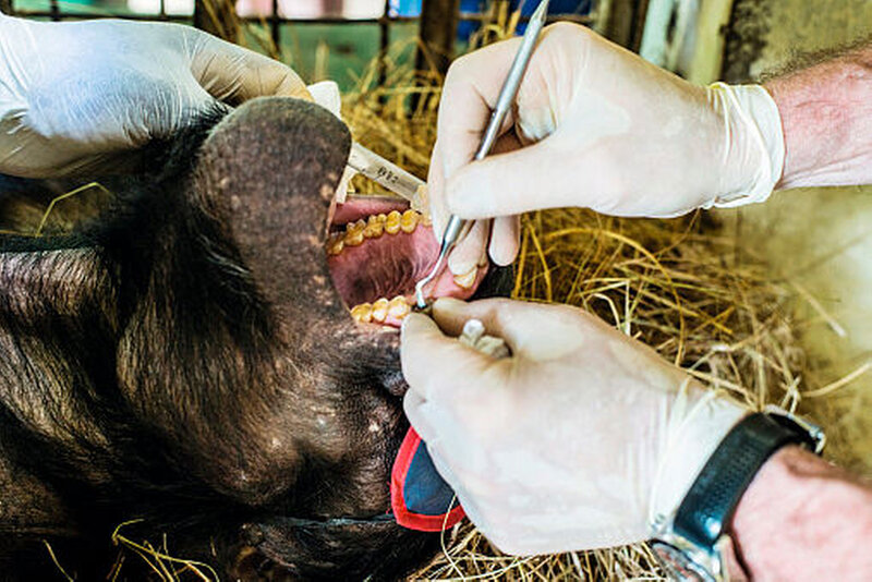 Kurz vor der Abreise sollte ein Schimpanse namens George behandelt werden. Der Befund: eine Fistel regio 21. Eine Extraktion war unumgänglich. Wir begannen die Behandlung, indem die Wärter den Schimpansen mit einem Dartpfeil betäubten. Darin steckte die Anästhesiespritze. Nach eingehender Prüfung – Affen können in so einer Situation sehr aggressiv sein – wurde unter Lokalanästhesie die Extraktion vorgenommen. Da Schimpansen zu 98 Prozent identische Gene mit uns Menschen haben und auch denselben Zahnstatus aufweisen, war die eigentliche Behandlung das geringste Problem. Der maßgebliche Unterschied zeigt sich an den Eckzähnen, die mit bis zu 50 Millimeter deutlich größer und länger sind.