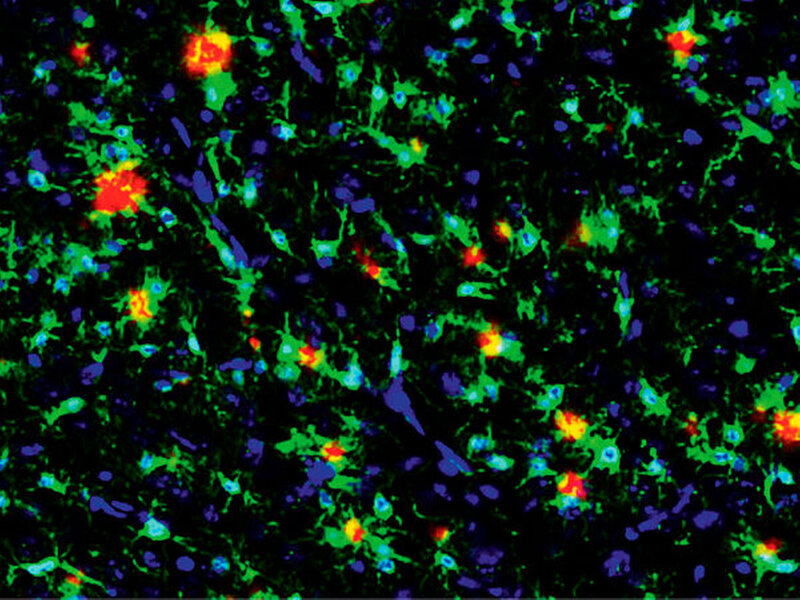 Mikroglia können lösliche Aβ-Oligomere über Zelloberflächenrezeptoren wie zum Beispiel TLRs („Toll-like receptor“) erkennen, was zu einer Aktivierung von Mikroglia führt. Mikroglia versuchen, Aβ-Ablagerungen durch Phagozytose abzubauen und einzudämmen (Abbildung 1). Eine anhaltende Aktivierung der Mikroglia und die Exposition gegenüber neurotoxischen proinflammatorischen Zytokinen und Chemokinen führt jedoch über die Zeit zur Degeneration von Neuronen, was entscheidend zum Fortschreiten der Krankheit beiträgt [Heneka et al., 2015].