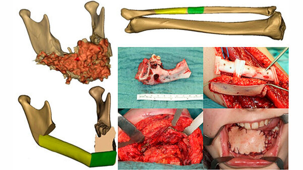 Auf Basis einer präoperativen computerassistierten Planung wurde eine Unterkieferteilresektion mit primärer Rekonstruktion mittels mikrovaskulärem Fibulatransplantat durchgeführt (Abb. 3). Die Patientin ist seitdem beschwerdefrei und es konnte keine weitere Progredienz des vorbestehenden Befundes beobachtet werden (Abb. 4).