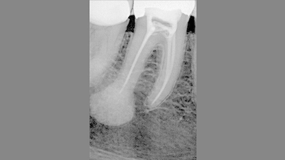 Der Zahn 46 reagierte immer noch eindeutig vital auf den durchgeführten Kältetest. Palpatorisch war im Bereich der distalen Wurzel des 46 vestibulär eine harte und nicht druckdolente Auftreibung zu tasten. Es gab keinerlei Anzeichen einer akuten Entzündung. Auch die regionalen submandibulären Lymphknoten waren unauffällig. Eine vorgeschlagene DVT lehnte die Patientin aus Kostengründen ab.