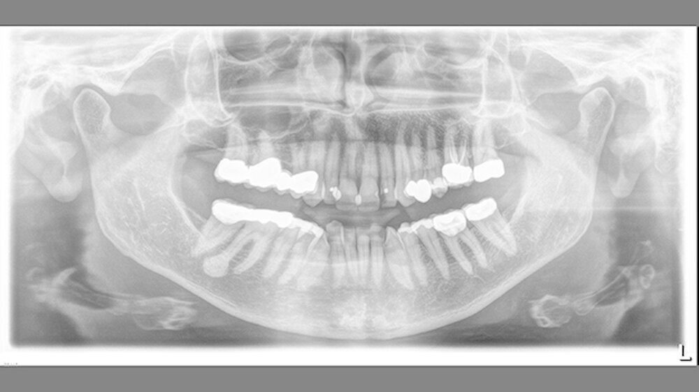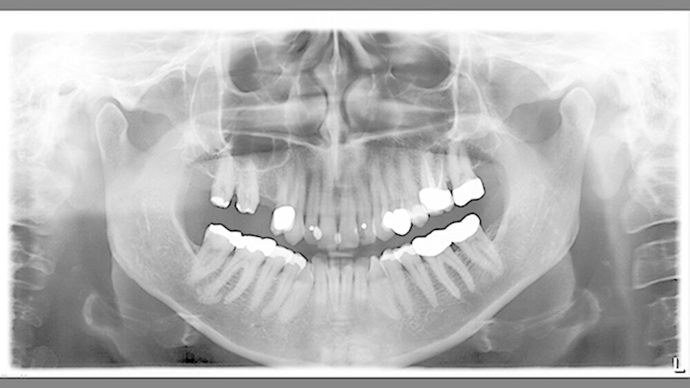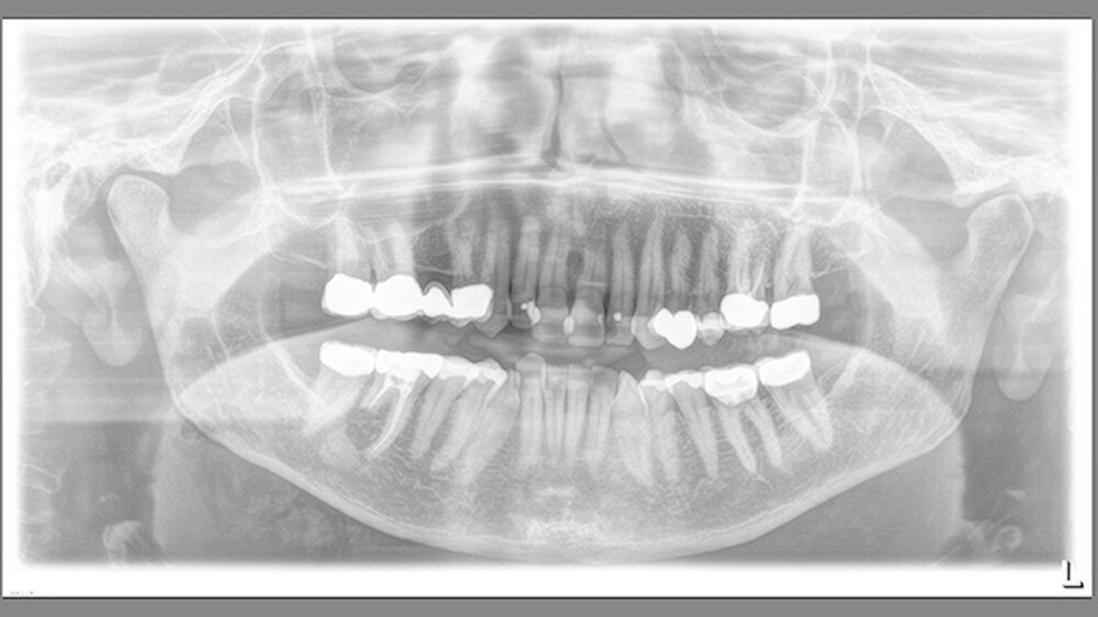 Auf dem Orthopanthomogramm stellte sich an der distalen Wurzel des Zahns 46 eine halbmondförmige, etwa zehn Millimeter große röntgenopake Verschattung dar. Dazu war eine etwa drei Millimeter große eiförmige dorsal davon gelegene kleine Auftreibung zu sehen, die mit der Wurzelspitze in Verbindung zu stehen schien. Die Vitalitätsprüfung des Zahns 46 war eindeutig positiv. Die Verdachtsdiagnose lautete „sklerosierende Ostitis 46“.