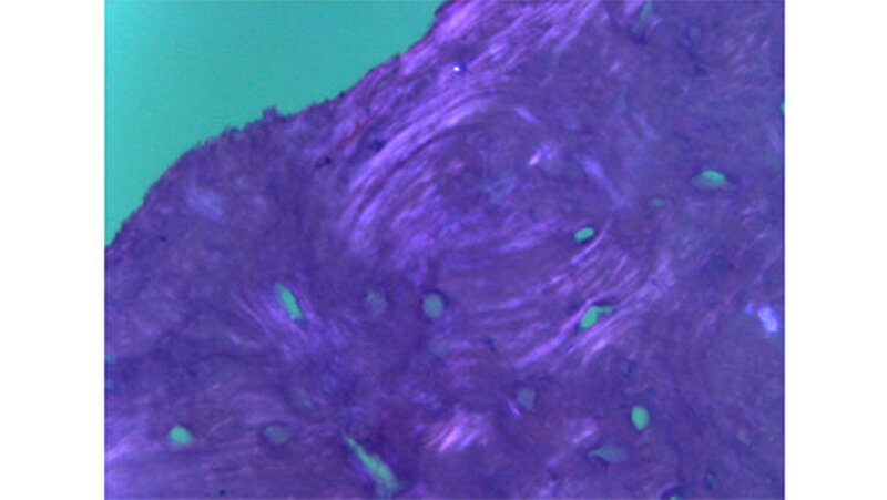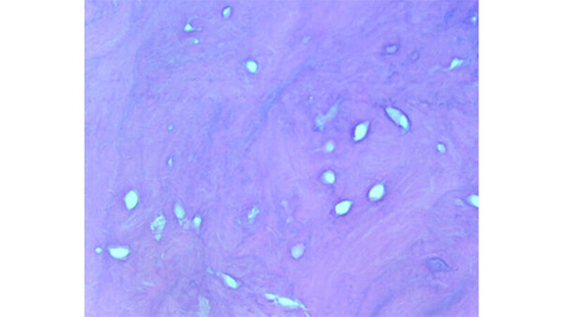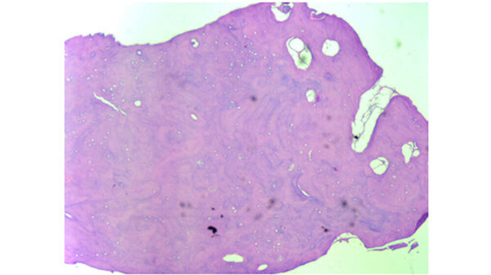 Klinisch zeigte sich, dass die knöcherne Veränderung nicht mit Blutgefäßen durchsetzt war. Erst nach vollständiger Entfernung konnte in der Defekttiefe aus der angrenzenden lingualen Spongiosa eine Blutung provoziert werden. Histologisch wurde ein Osteom aus kompaktem, regressiv verändertem Lamellenknochen mit überwiegend leeren Osteozytenlakunen sowie sehr vereinzelt unreifes Osteoid mit aktivierter Bindegewebszone nachgewiesen.