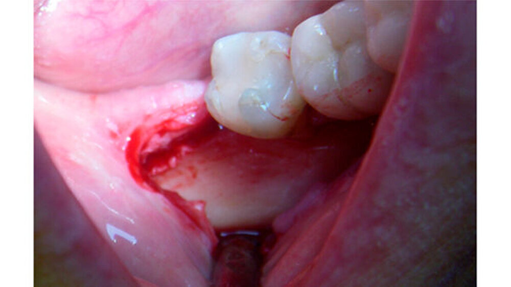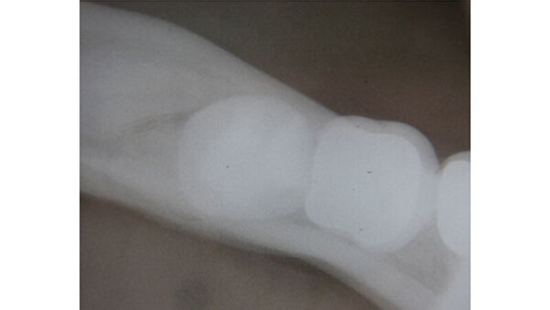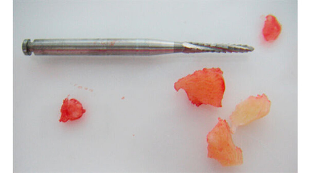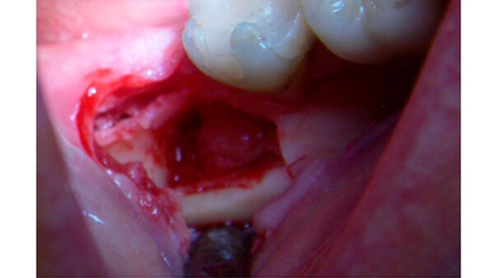 Der Zahn 47 reagierte positiv auf den Vitalitäts-/ Sensibilitätstest. Eine dreidimensionale Bildgebung musste von der Patientin aus wirtschaftlichen Gründen abgelehnt werden. Die Verdachtsdiagnose: ein Osteom oder ein Zementom. Zur explorativen Probeexzision wurde nach minimalinvasiver Schnittführung ein Knochendeckel präpariert, was eine berührungslose Darstellung der knöchernen Veränderung erlaubte. Weil die Veränderung sehr hart und spröde war, konnte sie nicht in toto entfernt werden.