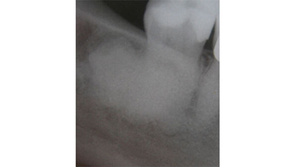 Eine 65-jährige beschwerdefreie Patientin stellte sich zur Routineuntersuchung in unserer Praxis vor. Diagnostiziert wurde eine generalisiert moderate, lokalisiert schwere chronische Parodontitis. Die im Rahmen der parodontalen Vorbehandlung durchgeführte Röntgendiagnostik zeigte eine haselnussgroße wolkige Verschattung regio 48. Anamnestisch wurde eine operative Entfernung des Weißheitszahns 48 vor ungefähr 35 Jahren angegeben.