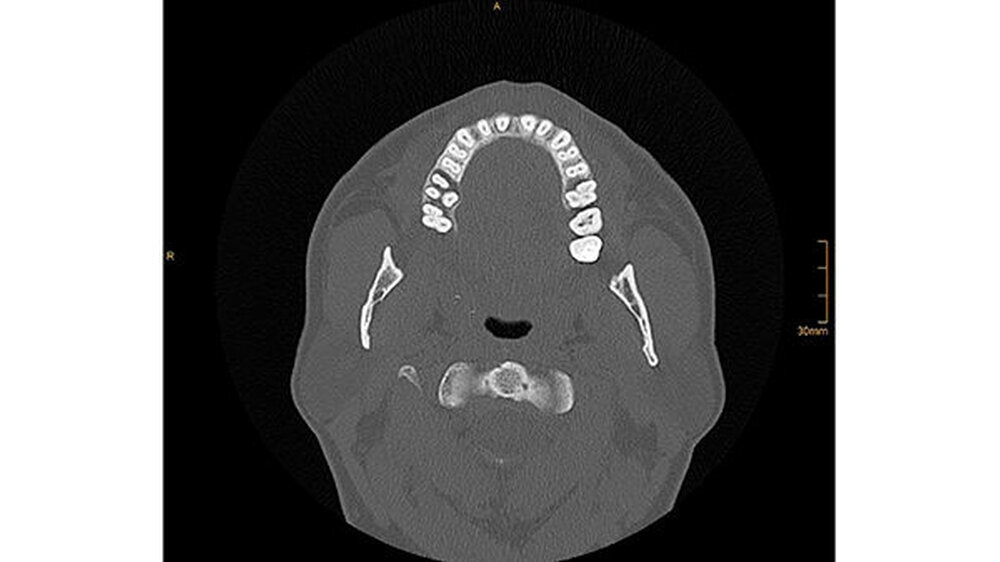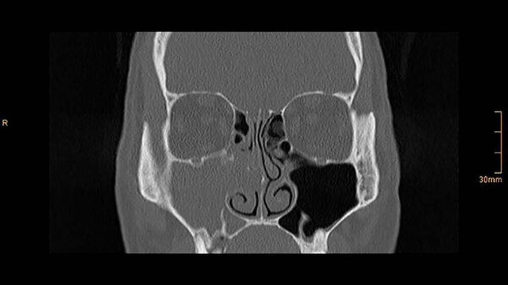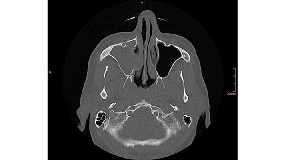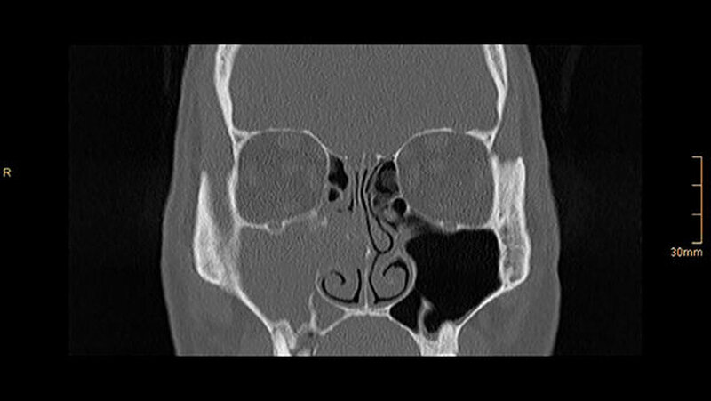 Die CT-Aufnahmen zeigen eine deutliche bis zum Orbitaboden heranreichende Totalverschattung der rechten Kieferhöhle. In Höhe des Zahns 16 zeigen sich periradikuläre Rarefikationen als Hinweis auf eine aggressive lokale Parodontitis.