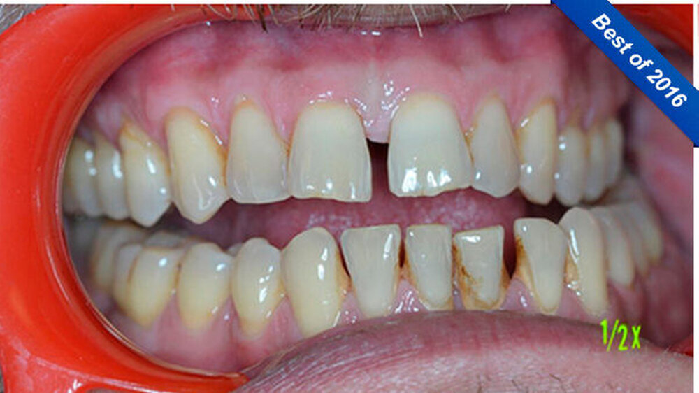 Ein 51-jähriger sportlich muskulöser Patient mit kariesfreiem Gebiss stellte sich zur konsiliarischen Untersuchung vor einer Operation der Kieferhöhle vor. Auf dem OPT imponieren der im Oberkiefer deutlich erkennbare horizontale Höhenverlust mit starker vertikaler Komponente in Regio 15/16 sowie der im Unterkiefer starke vertikale Knochenverlust in Regio 36. Allgemeinerkrankungen oder Medikationen wurden anamnestisch verneint.