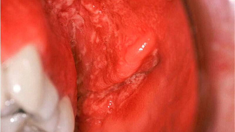 Gingiva und Mukosa wiesen bei unserem Patienten einen gleichmäßigen, ganz leicht orangeroten Farbton auf. Als ein weiteres Merkmal der Pyostomatitis vegetans trat bei dem Patienten eine Schleimhautfalte der Wangenmukosa auf, die zu den reaktiven Wucherungen zu zählen ist (Abb. 4, 9).