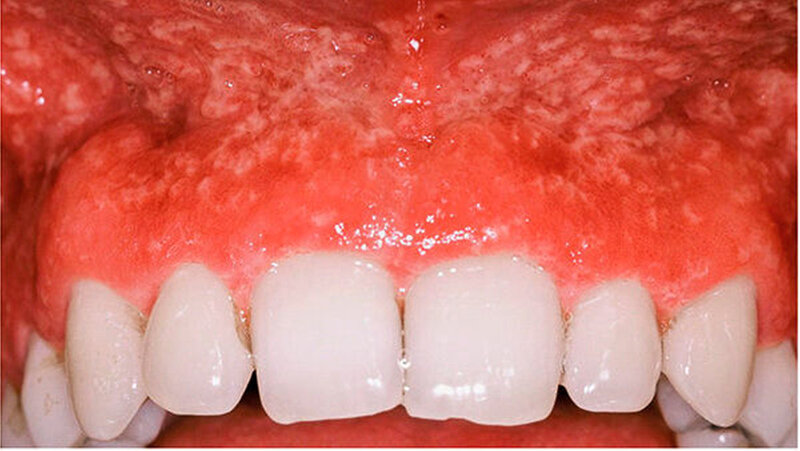Nach der Therapie wurde bei dem hier vorgestellten Patienten ein unerwartetes klinisches Erscheinungsbild der Gingiva mit kleinen, blassrosa Verdickungen beobachtet und von uns als granuläre bzw. papuläre fibröse Gingivahyperplasie bezeichnet.