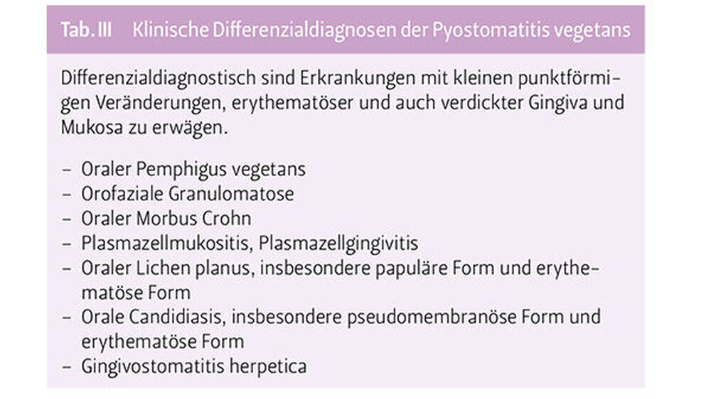 Zur Unterscheidung beider Erkrankungen trägt außerdem die histopathologische Untersuchung wesentlich bei. Der Morbus Crohn ist gekennzeichnet durch nicht verkäsende Epitheloidzellgranulome mit oder ohne vielkernige Riesenzellen. Diese sind aber bei der Pyostomatitis vegetans nicht zu finden. Die wichtigsten Differenzialdiagnosen sind inTabelle IIIzusammengestellt.
