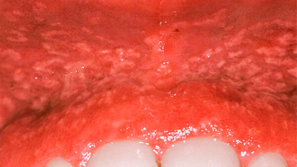 Erwähnt werden soll, dass bei dem hier vorgestellten Patienten die Ausdehnung der entzündlichen Rötung von der Papillenspitze bis zur Mukogingivalgrenze reichte und kontinuierlich weiter in die Schleimhaut der Umschlagfalten überging (Abb. 1-4). Es gab in den erkrankten Regionen keinen Bezirk oder schmalen Saum von klinisch gesund erscheinender Gingiva oder Mukosa - flächig und kontinuierlich waren Gingiva und Mukosa betroffen.