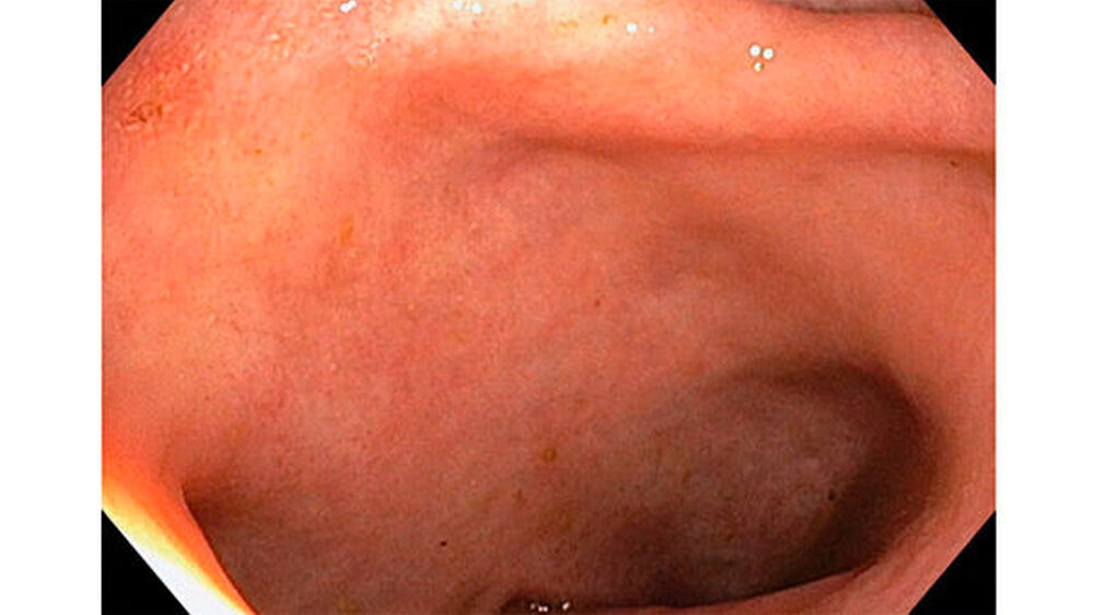 Im Hinblick auf eine mögliche Assoziation der Pyostomatitis vegetans mit einer Darmerkrankung wurde der Magen-Darm-Trakt mittels Gastro-, Duodeno- und Koloskopie untersucht. Während die Gastroduodenoskopie keinerlei Anzeichen auf pathologische Befunde ergab, zeigte sich in der Koloskopie eine leichtgradige Kolitis. Die Mukosa des Dickdarms wies im Bereich des linken Hemicolon mit Betonung des Colon sigmoideum eine dezente Schwellung, Granularität und Rötung auf (Abb. 6).