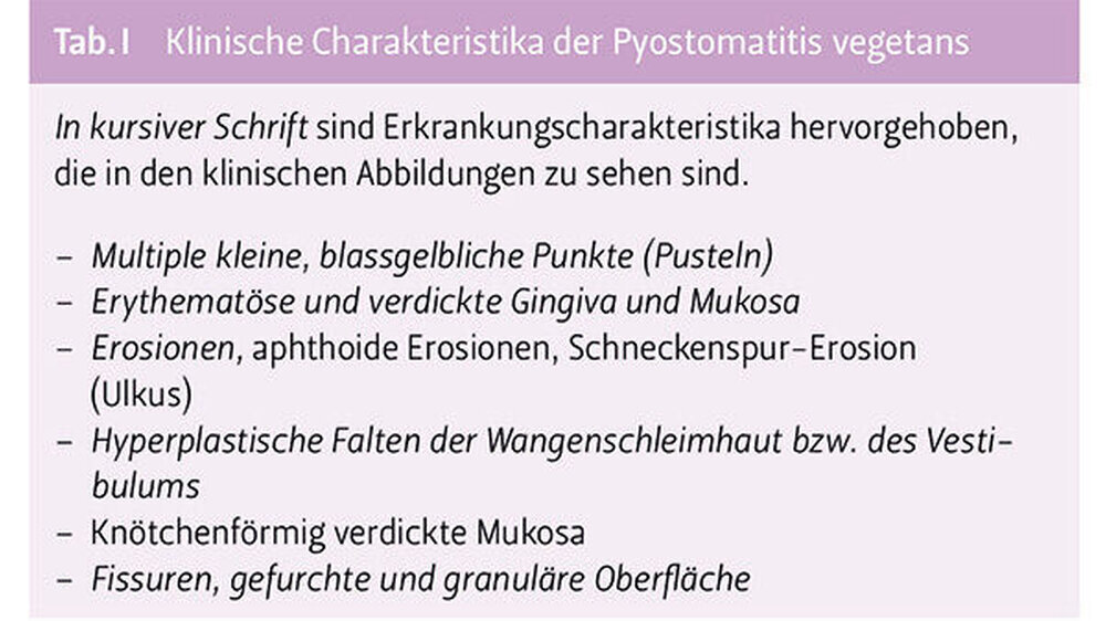 Die Lokalisation der Pyostomatitis vegetans ist bei voller Ausprägung typischerweise bilateral, oft bilateral symmetrisch, wie bei dem nachfolgend beschriebenen Patienten, kann aber auch nur einzelne Stellen oder eine Stelle betreffen, z.B. im Vestibulum oder am Gaumen. Die bevorzugten Erkrankungsregionen der Pyostomatitis vegetans sind Zahnfleisch, Umschlagfalten, Lippen und Wangenschleimhaut sowie harter und weicher Gaumen. Grundsätzlich jedoch können alle Regionen der Mundschleimhaut und die Lippen betroffen sein. Einen Überblick der klinischen Charakteristika der Pyostomatitis vegetans bietetTabelle I.