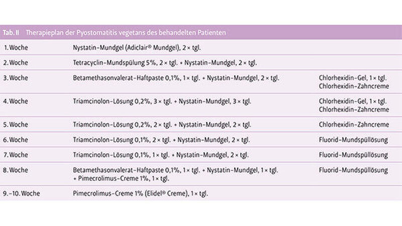 Als Fazit der Therapie lässt sich festhalten, dass eine Pyostomatitis vegetans bei gleichzeitiger leichtgradiger Kolitis mit Erfolg allein lokal behandelt werden konnte. Mit den gewählten und in Kombination angewandten Medikamenten stehen Mittel zur Verfügung, die sich in der Behandlung der Pyostomatitis vegetans als wirksam und in der hier beschriebenen Anwendungsweise als nebenwirkungsarm erwiesen haben. Häufig ist die Pyostomatitis vegetans mit entzündlichen Darmerkrankungen assoziiert und sollte als Hinweis auf diese angesehen werden.