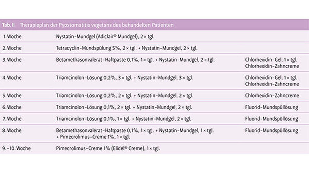 Die Behandlung der Pyostomatitis vegetans bestand aus einer Kombination von Glukokortikoid, Tetracyclin und Pimecrolimus-Anwendung mit antimykotischer und antibakterieller Begleitbehandlung. Die Pyostomatitis vegetans wurde allein lokal behandelt. Begonnen wurde die Therapie mit einer antimykotischen Vorbehandlung (Adiclair® Mundgel, Ardeypharm, Herdecke, Deutschland), gefolgt von einer topischen Tetracyclin-Anwendung in Form einer 5-prozentigen Tetracyclin-Mundspülung für eine Woche.