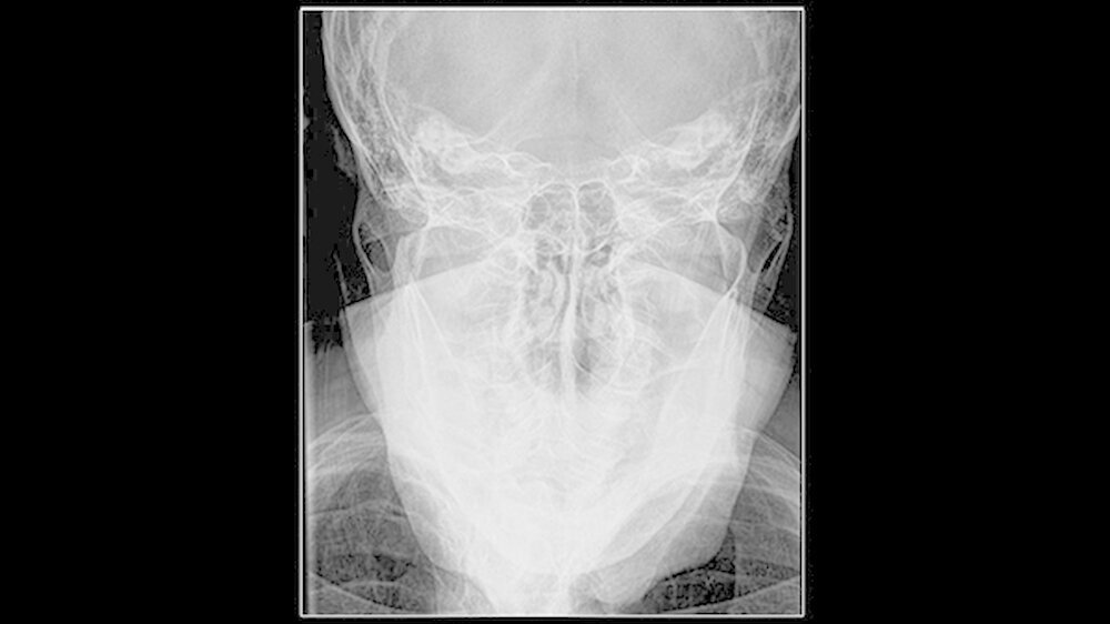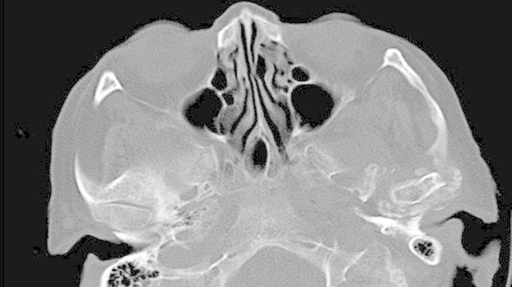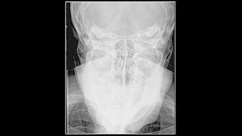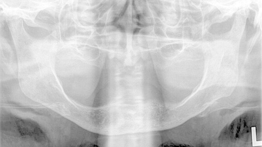 Die klinische Untersuchung zeigte eine überwärmte, schmerzhafte Schwellung präauriculär links und eine stark eingeschränkte Mundöffnung bei zahnlosem Kiefer. Das angefertigte Orthopantomogramm und die Schädelaufnahme in posterior-anteriorer Projektion gaben keinen eindeutigen Hinweis auf Pathologien im Bereich des linken Kiefergelenks, mit denen die ausgeprägten Beschwerden der Patientin hätten erklärt werden können.