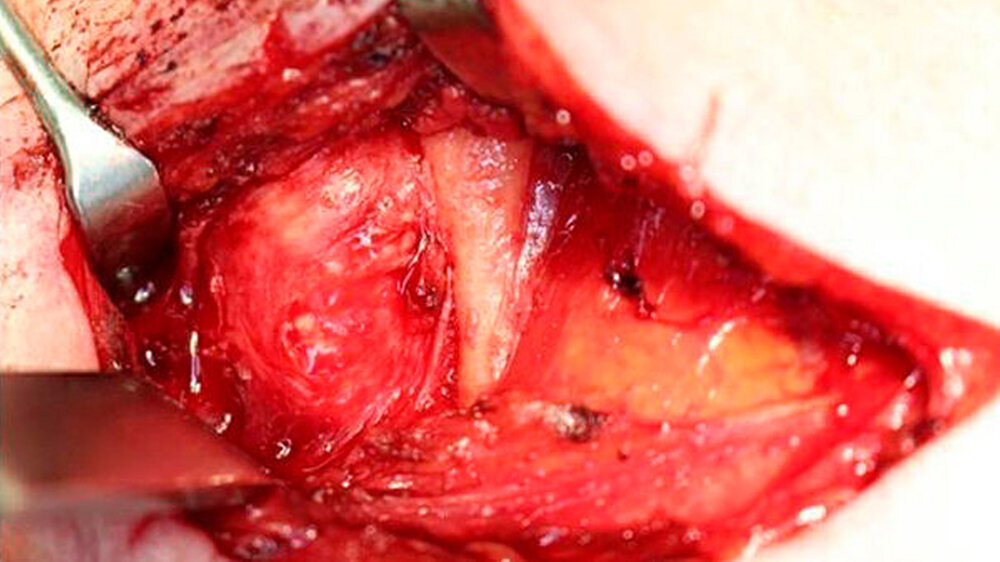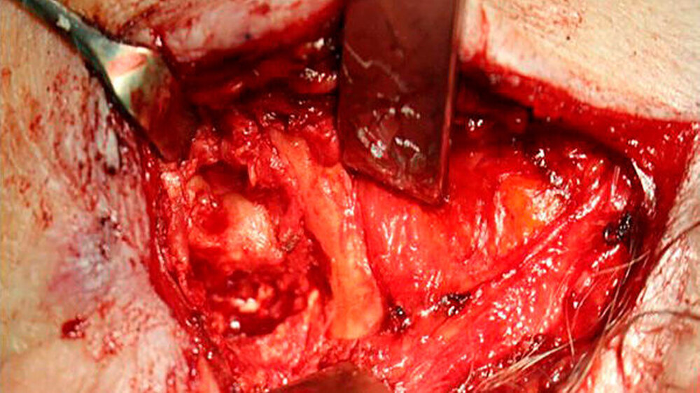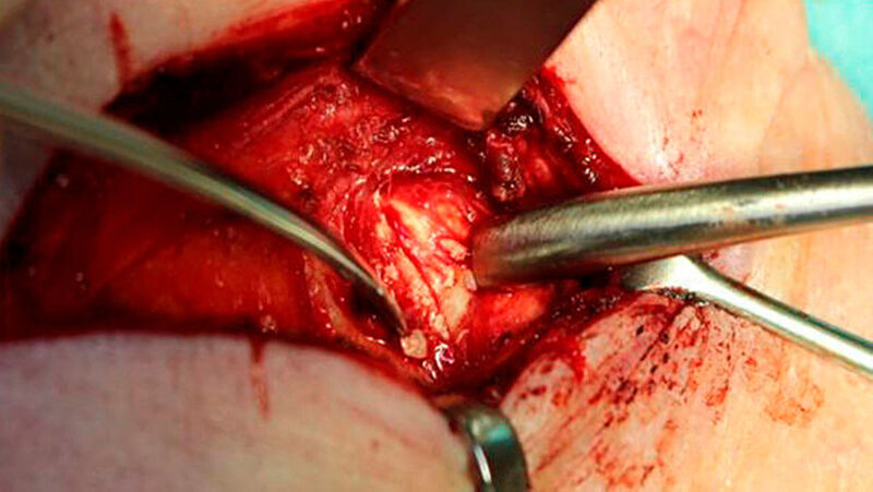 Das linke Kiefergelenk wurde über einen präaurikulären-temporalen Zugang unter Schonung des N. fazialis dargestellt. Nach Sichtbarwerden der deutlich verdickten Gelenkkapsel erfolgte die Inzision circa zwei Millimeter unterhalb der Gelenkgrube und Eingehen in den oberen Gelenkspalt (Abbildungen 5 und 6). Mithilfe der Schere wurde nun die Adhärenz des Discus artikularis von der Gelenkkapsel scharf getrennt und damit in den unteren Gelenkanteil eingegangen.