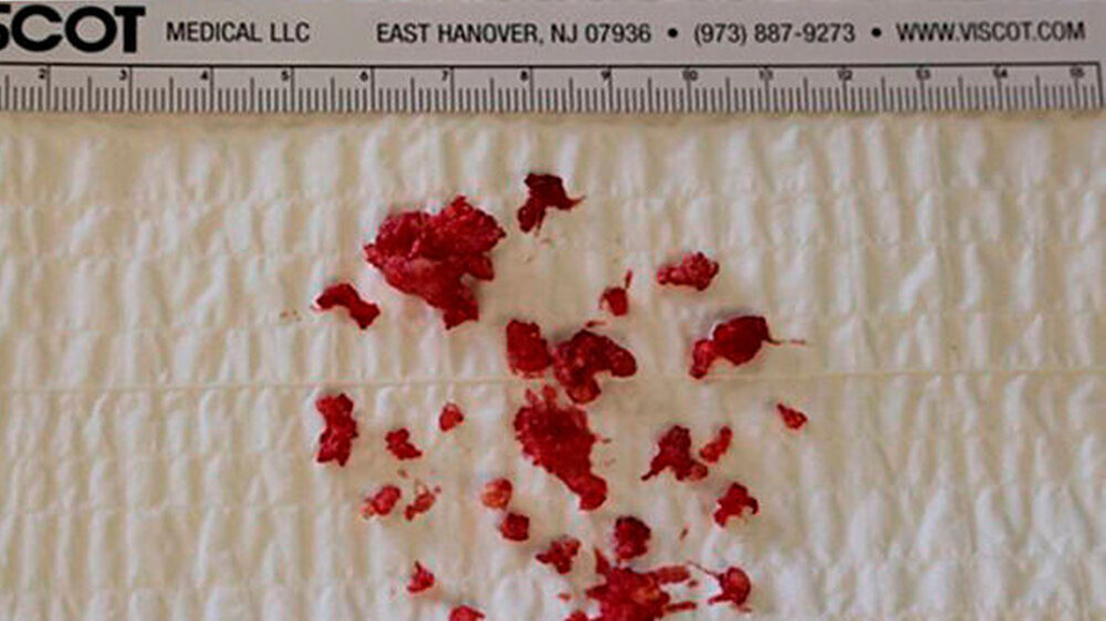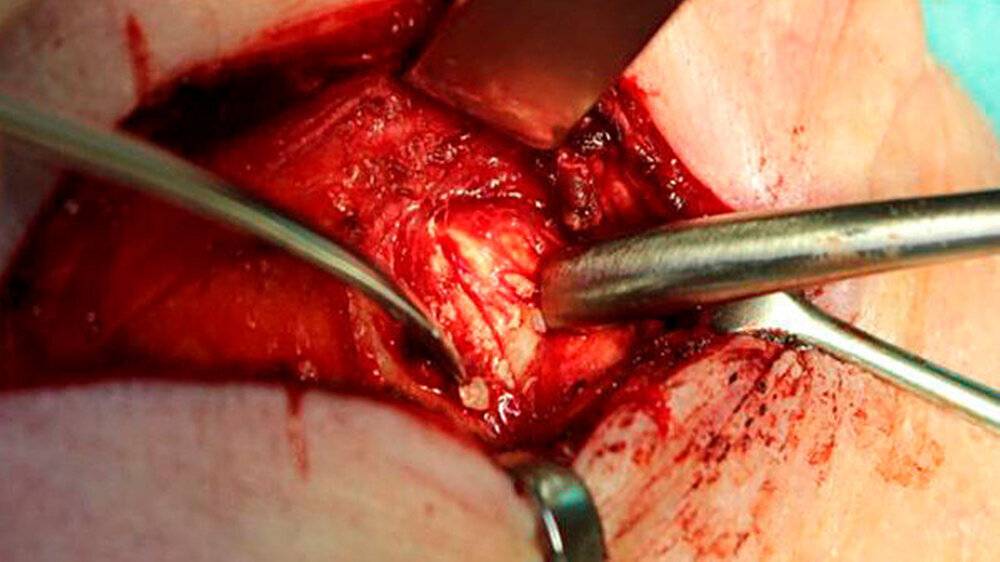 Die sich in situ befindlichen Fremdkörper wurden mit einem kleinen scharfen Löffel entfernt und das Gelenk nochmals gespült (Abbildung 8). Anschließend erfolgte eine adaptierende Naht der Gelenkkapsel und das Einbringen einer 8-er Redon-Drainage in die Wundhöhle. Nun erfolgten die Subkutan-Naht sowie die Hautnaht und das Anlegen eines sterilen Verbandes. Die entfernten Fremdkörper wurden zur patho-histologischen Untersuchung in Formalin aserviert und versandt.