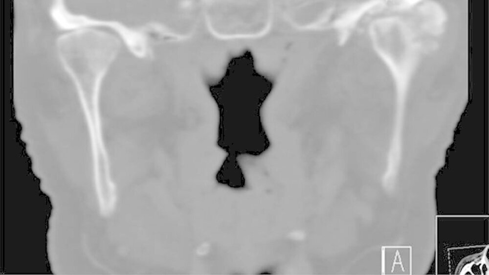 Es war lediglich ein stark verschmälerter Gelenkspalt im Bereich des linken Kiefergelenks erkennbar, woraufhin eine Computertomografie des Unterkiefers durchgeführt wurde (Abbildungen 1 und 2). Dabei zeigten sich eine Deformierung des linken Kiefergelenksköpfchens mit Unregelmäßigkeiten der Kortikalis sowie eine Fremdkörpereinlagerung (freie Gelenkkörperchen) im Bereich des Gelenkspalts (Abbildungen 3 und 4).