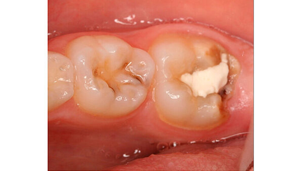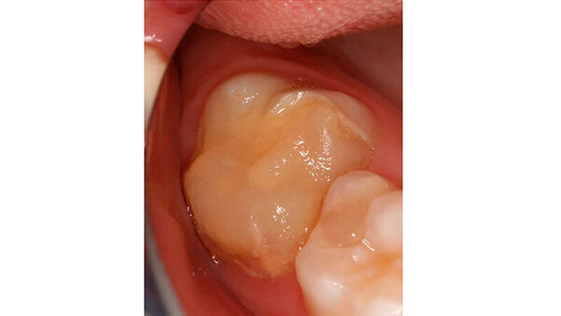 Temporäre Versorgung mit Glasionomerzement: Insbesondere in schlecht trocken zu legenden Bereichen kann ein Glasionomerzement eine vorübergehende Lösung darstellen. Hinzu kommen die Bindung an Schmelz und Dentin und Fluoridabgabe. Da bei MIH-Zähnen aber oft die Kaulast tragenden Bereiche betroffen sind, sind Glasionomerzemente wiederum als eher ungeeignet einzustufen und werden deshalb nur als vorübergehende Therapieoption empfohlen (Abbildung 11).