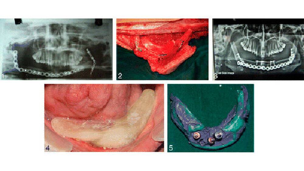 Der Fall:In diesem Fallbericht geht es um eine 24-jährige Frau. Eine Geschwulst in ihrem Kiefer war drei Jahre zuvor entfernt und der Kiefer mit Material aus einem ihrer Wadenbeinknochen wiederaufgebaut worden - ohne Erfolg. In einer zweiten OP wurde der Eingriff wiederholt. Zusätzlich wurden vier Implantate inseriert und eine Zahnprothese eingefügt.