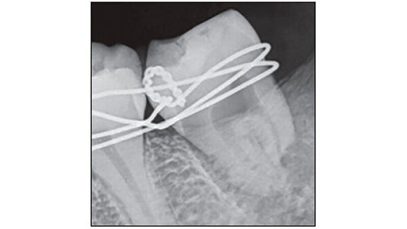 Zahn 38 wurde in das vorbereitete "Bett" von 37 transplantiert. Mit Nahtmaterial (Nähte India Pvt Ltd, Indien) stabilisierten die Zahnärzte die Position des transplantierten Zahns (Abbildung 3). Die intraradikuläre Schienung erfolgte mit formbarem kieferorthopädischem Draht (Tru-Bogen, Ormco Ltd., USA). Anhand eines postoperativen Röntgenbilds wurde die neue Position des 38 überprüft. Zur Unterstützung des Heilungsprozesses bekam die Patientin einen parodontalen Wundverband (Coe-Pack, G C Indien) angelegt.