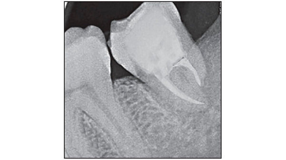 Beim Follow-up nach einem Monat zeigte sich bei der intraoralen Untersuchung eine ausreichende Stabilität des Zahns 38 in der "Fassung" des ehemaligen Zahns 37. Auf einen Kofferdam wurde verzichtet, um den 38 durch die Kofferdamklammer nicht zu schädigen. Mesiale und distale Kanäle wurden mit NiTi-Handfeilen (Denstply Maillefer, Ballaigues, Schweiz) gereinigt und mit Kochsalzlösung 0,9 Prozent w / v (Alkem Laboratories Ltd., Indien) und 5,2 Prozent Natriumhypochlorit (Surya Fine Chemicals getan Ltd., Indien) gespült. Daraufhin erfolgte die Aufbereitung der Kanäle. Ein Calciumhydroxid-Verband (Metapex, Meta Dental Corporation, USA) wurde für zwei Wochen angelegt, um die periapikale Heilung voranzutreiben.