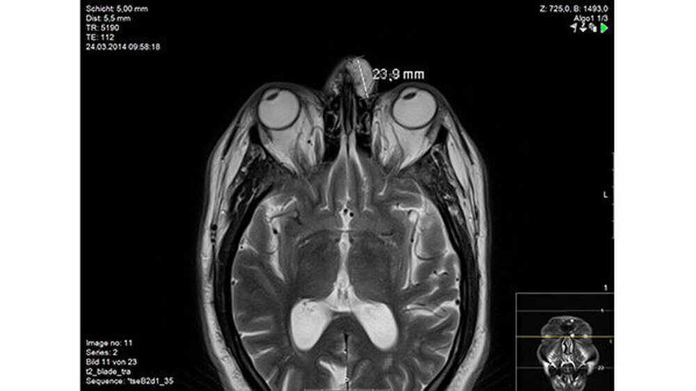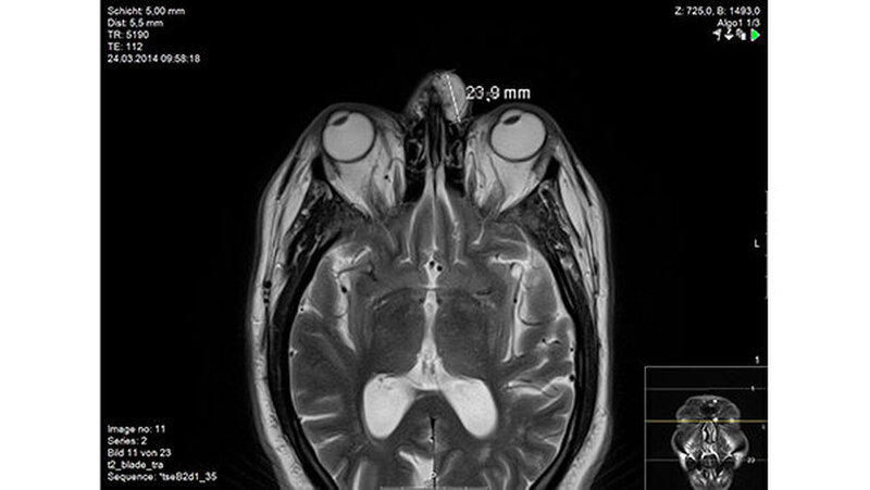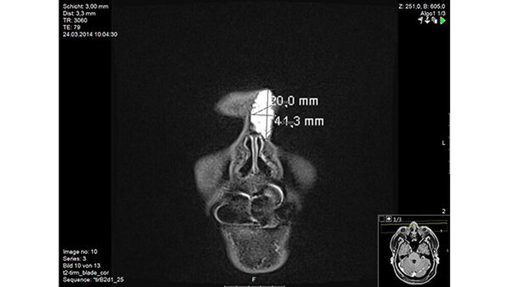 In der Magnetresonanztomografie des Gesichtsschädels zeigte sich eine etwas lobuliert imponierende und signalreiche Läsion frontonasal subkutan links. Der Tumor war mittellinienüberschreitend und zeigte ein koronares Ausmaß von 20 x 40 Millimetern sowie ein transversales Ausmaß bis zu maximal 24 Millimeter (Abbildungen 2 und 3 ).