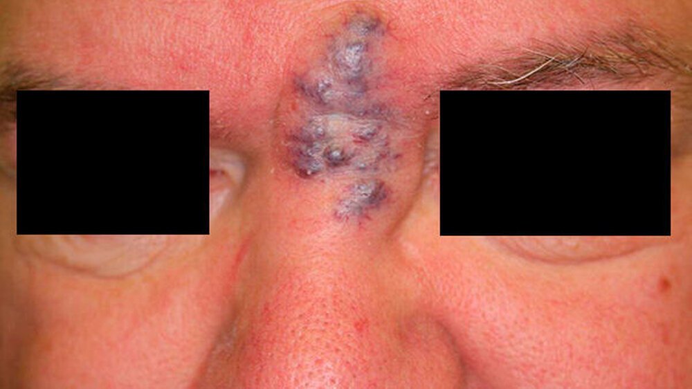 Ein 51-jähriger Patient wurde mit einem seit längerem bestehendem bläulichen Tumor im Bereich des oberen Nasenrückens und der Glabellaregion über unsere mund-, kiefer- und gesichtschirurgische Ambulanz vorstellig. Er berichtete von einer Spontanblutung aus dem Tumor in der letzten Nacht.