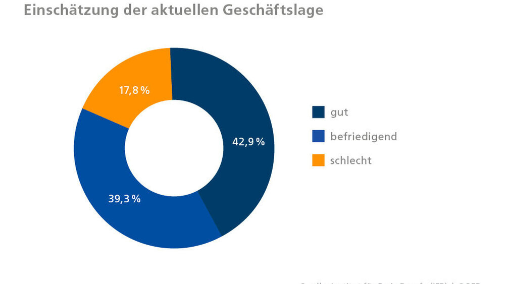 Den Umfrageergebnissen zufolge stufen 2,9 Prozent der befragten Freiberuflerinnen und Freiberufler ihre aktuelle Geschäftslage als gut ein, 39,3 Prozent als befriedigend und 17,8 Prozent als schlecht. Damit ist die Stimmung verglichen mit den Sommer-Werten 2022 eingetrübt: Vor einem Jahr lagen die Werte noch bei 45,6 Prozent (gut), 41,8 Prozent (befriedigend) und 12,6 Prozent (schlecht).